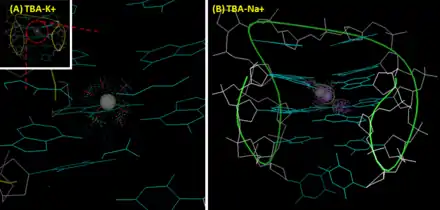 In addition to protein-selectivity, TBA also shows ion preference. A potassium ion helps TBA fold into a G-quadruplex structure, which results in a significant positive band at 295 nm and a negative band at 270 nm on its circular dichroism (CD) spectrum. Also, potassium ion improves the thermal stability of TBA.[8] The melting temperature of TBA's G-quadruplex (measuring the intensity change of the peak at 295 nm by CD) in the presence of sodium ion and potassium are 24 °C and 53 °C, respectively.[7] Compared with sodium, potassium ion fits perfectly to the cavity between two G-tetrad plane and is coordinately bound to four O6 atoms in each plane. This enhances the structural stability of TBA. In contrast, due to its small size, sodium ion can only interacts with four rather than eight oxygen atoms of two G-tetrad planes, and accordingly has two alternative position in the cavity. Thrombin shows similar influence as potassium ion. In the ion-deficient condition, thrombin helps TBA form into a stable G-quadruplex structure from a randomized coil, which results in conformational change.[8] Some groups use this property to develop aptamer-based thrombin sensors. For this purpose, TBA is usually mounted with an additional sequence with a FRET (Förster resonance energy transfer) pair to form a transient duplex structure. Once the TBA part interacts with thrombin, the conformational change would change the distance between the FRET pair and lead to a fluorescent output. This approach provides nano-molar sensitivity and is capable of sensing thrombin in the spiked serum.[9]