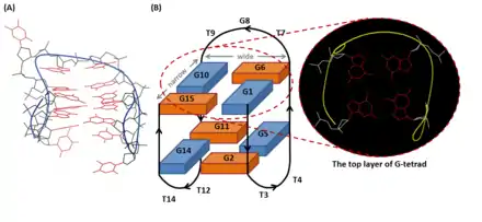 The tertiary structure of TBA is an anti-parallel G-quadruplex. This chair-like structure is folded through the stacking of two guanine (G)-tetrads, and four guanines interacts with one another through non Watson-Crick-like hydrogen bonds (more likely Hoogsteen-like hydrogen bonds). In the structure of TBA, G1, G6, G10 and G15 form the top layer of G-tetrad; G2, G5, G11 and G14 form the second layer. The first crystallographic images with 2.9 Å resolution (1HUT) was reported in 1993. It showed that the T7-G8-T9 loop and TT loops (T3-T4 and T12-T13) connected the narrow and the wide grooves, respectively.[5] However, since the improved NMR (1HAO) [6] and X-ray crystallographic images (4DIH; 4DII) [7] were provided, another topology with the TGT loop on the wide side and the TT loops on the narrow sites has been considered as a correct structure of TBA.