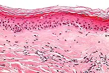 | Micrograph of subepithelial sclerosus (middle third of image) in a case of lichen sclerosus. H&E stain. | |