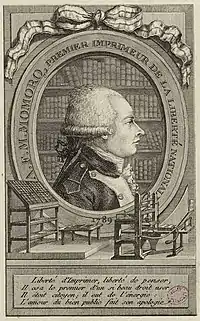 Antoine-François Momoro (French pronunciation: [ɑ̃twan fʁɑ̃swa mɔmɔʁo]; 1756 – 24 March 1794) was a French printer, bookseller and politician during the French Revolution. An important figure in the Cordeliers club and in Hébertisme, he is the originator of the phrase ″Unité, Indivisibilité de la République; Liberté, égalité, fraternité ou la mort″, one of the mottoes of the French Republic.[1][2][3]