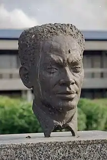 Part of his unpublished novel Ons bloed is rood (Our blood is red) appeared in Adek (1983).[5] In 1988, the Surinamese Worker and Unemployed Organisation (SAWO) submitted a motion with the municipality of Amsterdam to name a square after Anton de Kom. A square in Amsterdam-Zuidoost near the shopping centre was renamed Anton de Komplein.[17] The square features a sculpture of Anton de Kom as a monument to his life and works, sculpted by Jikke van Loon.[18] SAWO went on to petition the Government for rehabilitation.[17]