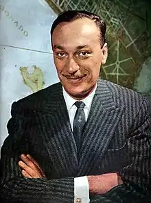 His later projects included serving as master of ceremonies at the 1980 OTI Festival, as well as the annual Ciclo Música en la Ciudad (City Music Series), a classical music festival, from 1987 onward.[6] He joined Juan Carlos Calabró as co-host of the radio comedy series, Calabromas, and its long-running television counterpart: El contra (The Jerk, Calabró's stock character).[1] Carrizo served as Cultural Attaché to the Argentine Embassy in Spain during the 1990s, and was bestowed the Order of Isabella the Catholic.[3] He later hosted El Locutorio (The Broadcast Room),[2] a cultural program, and Papeles Sueltos (Loose Papers), an intellectual round table show.[7] He also hosted, among other programs, Hecho en Argentina, a geographic documentary series on the América 24 cable network, and from 2006 onward Tangos y Libros on Municipal Radio.[8]