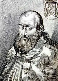 He participated in the papal conclave of 1521–22 that elected Pope Adrian VI.[1] In February 1523, the new pope placed him in charge of a commission in charge of reducing expenditures by reducing curial offices created by Leo X.[1] In the consistory of 23 July 1523 Cardinal Ciocchi del Monte opposed the creation of a defensive league with Charles V, Holy Roman Emperor, fearing it would strain relations with Francis I of France.[1]