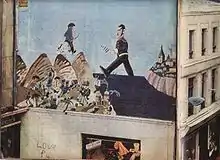 A recurring theme in Seguí's work is urban life and its inhabitants which seem like speedy automatons that take immutable routes leading nowhere. Up close, each figure is an individual, walking around and doing all kinds of things. But from a distance, the individuals form complex patterns in a labyrinthic landscape.[2] In many of his works a vast crowd of figures coverins the entire surface area of the canvas, like in Gente de las azoteas (1992), Se llamaba Charles Atlas (2001) or Pasar desapercibido (2001). But with a large number of his canvases the focus is on individual figures, like Sacando la Lengua (1965) and EI Fumador (1966).[5]
