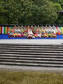 There are two main figures in the Aoi Matsuri: the Saiō-Dai and the Imperial Messenger.[2] Historically the Saiō-Dai was a woman of the imperial house who was chosen from the sisters and daughters of the emperor to dedicate herself to the Shimogamo shrine. The role of Saiō-Dai was to maintain ritual purity and to represent the emperor at the festival. Nowadays, the role of the Saiō-Dai is a stand-in by an unmarried woman in Kyoto.[2] She has to have the three attributes of wisdom, grace, and social standing. The selection process is strict and the news is announced in the press. It is the highest honour a woman can receive in Kyoto. The Saiō-Dai is dressed in the traditional style of the Heian court. Traditional Heian court dress for women would be wearing several layers of exquisitely colored silk robes.[9] The Saiō-Dai wears twelve layers of the traditional style robes (jūnihitoe).[10] To maintain ritual purity, the Saiō-Dai goes through several ceremonies of purification before the procession of the festival. The Imperial Messenger leads the festival procession on horseback.[2] During the Heian period he would be a Fifth-Rank courtier holding the office of middle or lesser captain and was usually a man destined for high office.[8] His role was to read the imperial rescript of the shrines and present the emperor’s offerings.[8] During the Heian period, the Saiō-Dai and the Imperial messenger would be accompanied by ten dancers and twelve musicians.[8] Also present during the procession are guards (kebiishii), government officials, civic officials, military retainers, and a delegate from Yamashiro (Yamashiro-no-Tsukai).[5]