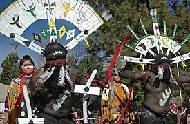 Apache Crown Dance or Gaan Dance (also called Mountain Spirit, Crown Dance, Devil Dance) is an Apache ceremonial dance that is intended to protect the community from disease and enemies. Dancers became "the embodiment of the Mountain Spirits (the Gaan)"; they wear special masks and wands during the dance. The dance is performed by a group of five members, one of them a "clown", each having his specific role. The dance is performed "on the final night of the Sunrise Dance ceremony".[1] The dance is described as following: