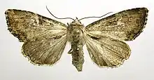 The wingspan is 32–36 mm. Forewing pale ochreous, usually washed with pale brown; a black-brown streak on inner margin before inner line; inner and outer lines fine and double, conversely lunulate edentate on the veins; a dark brown or pale brown median shade, enlarged, like the inner line, on the costa into a cloud; orbicular stigma pale, brown edged: reniform with brown lunular centre and white annulus, constricted at middle; terminal area brown, traversed close to termen by the paler subterminal line which forms a pale spot at apex; fringe mottled brown and ochreous; hindwing ochreous washed with grey or fuscous; — in ab. abbreviata Haw. the ground colour is pale ochreous without the brownish suffusion; in hammoniensis Sauber the costal and terminal dark areas are intensified, and the whole wing is suffused with greyish fuscous; in the Japanese form, however, ab. subbrunnea ab. nov. [Warren], the whole wing is washed with pale brown; the oblique bar near base of inner margin is either brown or obsolete: the dark blotches on costa and the brown terminal area are pale brown; all the lines are obscured, the only clear marking being the whitish reniform; hindwing pale grey or brownish grey, with dark cellspot and outer line; in all the forms the male is regularly slightly darker than the female.