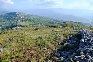 The city walls of isodomic limestone masonry still exist on the south and west sides. Remains of at least two buildings also in isodomic, lie on the E side of the plateau. On the top of the hill is a large rock-cut cistern.