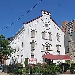 The former Society of Friends (Quaker) meetinghouse was built 1868, described in the AIA Guide to New York City as "A simple Lombardian Romanesque box polychromed with vigor by its current tenants." As of 1977, it was the Apostolic Faith Mission.[1]