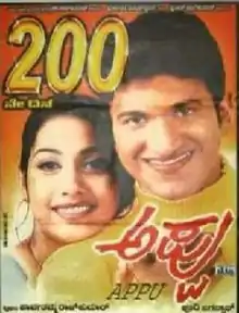 Appu is a 2002 Indian Kannada-language romantic action comedy film directed by Puri Jagannadh. It stars Puneeth Rajkumar and Rakshita. The supporting cast features Avinash, Srinivasa Murthy and Sumithra. The film was produced by Puneeth's mother, Parvathamma under Poornima Enterprises, the production banner of the Rajkumar family. It marked the screen debut of Puneeth and Rakshita in lead roles.[1]