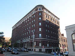 The Hotel Kimball was once "Western Massachusetts finest hotel." Built in 1910, and opened on St. Patrick's Day, 1911, the New York Times reviewed the Hotel Kimball as "ranking with the finest [hotels] in the country. A magnificent hotel, modern and metropolitan in every appointment."[6] In 1920 it hosted the United States' first-ever commercial radio station - WBZ, Springfield.[7] U.S. Presidents Franklin D. Roosevelt, Dwight D. Eisenhower, and John F. Kennedy all stayed at The Kimball - some before and some after the 1940s transition into the Sheraton-Kimball Hotel, operated by Sheraton Hotels and Resorts. The Kimball was the first "grand hotel" purchased by Sheraton, a company that was, at the time, headquartered in Springfield.