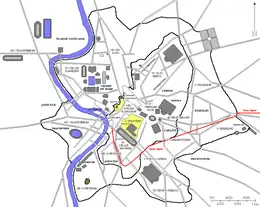 It flowed for 16.4 km (10.2 mi) to Rome from the east and emptied into the Forum Boarium near the Porta Trigemina. Nearly all of its length before entering the city was underground, which was necessary because of the relative heights of its source and destination, and which also afforded it protection from attackers during the Samnite Wars that were underway during its construction.[1] After entering the hilly area of Rome, the aqueduct alternated between tunnels through the Caelian and Aventine Hills and an elevated section. A detailed modern model of ancient Rome shows the aqueduct running along the top of the Servian Wall above the Porta Capena.[4] It dropped only 10 metres (33 ft) over its entire length, making it a remarkable engineering achievement for its day.