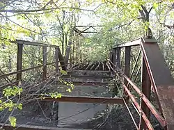 Aqueduct Bridge, also known as the Coffey Bridge and Clay County Bridge #182, is a historic Pratt through truss and Pratt pony truss bridge located in Perry Township and Sugar Ridge Township, Clay County, Indiana. The original span was built by the Cleveland Bridge and Iron Company in 1880 and the second section by the Vincennes Bridge Company in 1920. It carries Towpath Road over Birch Creek. The original span measures 60 feet (18 m) and the second span 102 feet (31 m) long. They rest on concrete abutments and a central pier.[2]:5