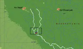 After their defeat at the Battle of Walaja, the Sassanid survivors of the battle who consisted mostly of Christian Arabs fled from the battlefield, crossed the River Khaseef (a tributary of the Euphrates) and moved between it and the Euphrates.[8][9] Their flight ended at Ullais, about 10 miles from the location of the Battle of Walaja, and 25 miles south-east of the Iraqi city of Najaf.[10] Here the Sasanian army received reinforcements from the Christian Arab tribe of Bani Bakr and other tribes in the region between Al-Hirah and Ullais, leading Khalid to crossthe river Khaseef with the Rashidun army and assault Ullais frontally.[11] Emperor Yazdegerd III meanwhile sent orders to Bahman Jaduya to proceed to Ullais and take command of Arab contingents there and stop the Muslims advance at Ullais.[12] It is estimated that the Sasanid army ultimately numbered 30,000 men.[13] When battle was joined, Tabari records that the Arab forces were initially unable to break through Sasanian lines. According to the narrative, Khalid then prayed to Allah and promised that he would flow rivers of blood if he won the battle. The tide of the battle turned, and the assaults of the Arab forces eventually broke the Sasanian morale and the Iranian troops started fleeing towards Al-Hirah. Thousands were killed, with the banks of the river turning red from the amount of dead, this fulfilling Khalid's oath.[14][9][15] The Sasanian commander Jaban however escaped.[9][16]