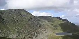 Aran Fawddwy is a mountain in southern Snowdonia, Wales, United Kingdom. It is the highest point (county top) of the historic county of Merionethshire (for local government purposes, it lies within the current council area of Gwynedd). It is the highest peak in the Aran mountain range, the only peak in Wales outside North Snowdonia above 900m, and higher than anywhere in the United Kingdom outside Northern Snowdonia, the Scottish Highlands (and islands) and the Lake District. The nearest small settlements to the mountain are Dinas Mawddwy to the south, Llanymawddwy to the southeast, Llanuwchllyn on the shores of Bala Lake to the north, and Rhydymain to the west. The nearest settlements with around 2,000 people are Bala and Dolgellau. On the eastern slopes of Aran Fawddwy is the small lake named Creiglyn Dyfi, the source of the River Dyfi. Its sister peak is Aran Benllyn at 885 metres (2,904 ft).[2] There is also a middle peak: Erw y Ddafad-ddu.