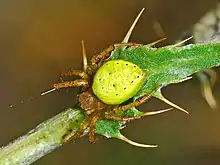 Araniella opisthographa can reach a body length of about 3.5–4 mm (0.14–0.16 in) in males, of about 4–6 mm (0.16–0.24 in) in females. The cephalothorax (prosoma) varies from yellow to red-brown, usually with broad dark marginal bands in males. The abdomen (opisthosoma) is definitely shiny yellowish green on top, with four black small depressions in the middle and five pairs of black lateral spots.[6] On the lower end of the abdomen there is a red mark. At the extremities of the pedipalps, males have the copulatory organs. Legs are yellow or red-brown. In males they are red and black ringed and femurs show several strong bristles along the whole length. This species is very similar to Araniella cucurbitina, that shows only 1-4 pairs of black lateral spots on abdomen.[5][6]