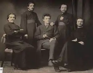 Among its leaders were students Ciprian Porumbescu, Gherasim Buliga, Ion Topală, Zaharia Voronca, Gheorghe Popescu and Dimitrie Onciul. They aimed to strengthen the identity and raise the prestige of Romanians in Bukovina. To this end, they organized conferences related to national literature and history, as well as Romanian-themed musical and literary evenings; set up a library and reading rooms; and maintained ties with other student societies in the Romanian Old Kingdom and in Transylvania.[2] Buliga was the first president, followed by Porumbescu.[5] The motto was by Vasile Alecsandri (Uniți să fim în cugete, uniți în Dumnezeu — "Let us be united in our thoughts, united under God"), members wore a ribbon with the blue-yellow-red of the Romanian tricolor, and the official song was written by Ștefanelli, with music by Porumbescu.[6]