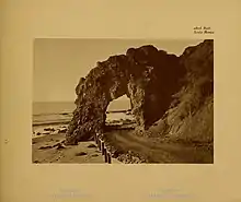 Arch Rock was located at what is now 18412 Pacific Coast Highway.[2] It was a popular destination for day trips from the young town of Santa Monica.[3] The arch collapsed or was surreptitiously demolished the evening of March 24, 1906, possibly because it was an inconvenient obstacle to creating a coast route for the new-fangled automobiles.[4] Another account says a railroad crew dynamited the formation under cover of darkness.[2] A coach route had previously traveled right under the arch but was only accessible at low tide.[5]