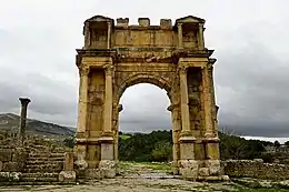 The Arch of Caracalla is a Roman triumphal arch located at Djémila in Algeria (Cuicul). It was built during the early 3rd century. The arch, with a single span (fornix), was placed on the road leading to Sitifis. It constituted the entrance to the city's Severan forum.