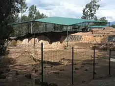 The platform is an artificial construction, walled in a rectangular plan, from limited excavations.[2] The more relevant walls are 3.3 metres (11 ft) high, 41 metres (135 ft) long and 0.60 metres (2.0 ft) wide.[2] On the eastern end, there is evidence of reinforcement, with a rectangular counter-wall, of dual pilasters, that includes four circular buildings.[2]