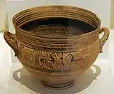 Classical pottery depicted myths and legends, ritual processions and social activities between men and women.[31] Scenes were predominantly painted on clay vessels using either Black-figure or Red-figure techniques; Black-figure and Red-figure pottery techniques were both used interchangeably up until the fifth century BC when Red-figure pottery became more widely used.[31] Red-figure pottery was also out of use by the end of the fourth century BC after a decline in quality.[32] During the sixth and fifth centuries BC, figure decoration lacked with vessels simply painted black with a metallic lustre.[31]