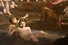 Regarding the nymphs, there is one in the water that is looking directly at the viewer.[12] This is Domenichino's way of bringing the audience into the painting, breaking down the barrier of viewer and subject. The nymph is smiling, as if she has caught the viewer in the bushes, watching this scene play out, therefore likening the viewer to the men in the painting.[12]