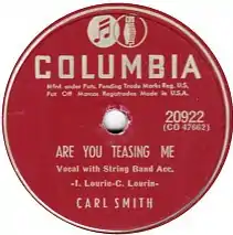 "Are You Teasing Me" is a song written by the Louvin Brothers (Charlie and Ira), sung by Carl Smith, and released on the Columbia label (catalog no. 20922). In May 1952, it peaked at No. 1 on Billboard's country and western jockey chart (No. 2 best seller and juke box).[1] It spent 19 weeks on the charts and was also ranked No. 11 on Billboard's 1952 year-end country and western juke box chart and No. 14 on the year-end best seller chart.[2]