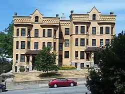 Argyle Flats is a three-story structure built on a raised basement. Its basic form is compact and rectilinear. It rises three floors above an exposed basement and features an asymmetrical facade. The smooth brick walls contrast with the rough textures of the cornices that feature Romanesque Revival corbelling and round-arched windows on the attic level in pointed gables that rise above the coping.[3] Decorative details are found at the building's main entrances and on the cornice. The cornice itself continues across the deeply recessed hyphen between the two facades, which minimizes the reality that the building is two separate blocks. Argyle Flats also features full-height, polygonal, projecting window bays. There are two entrances in the main facade that each lead to flats on one side of a bearing or party wall. The exteriors of both sides of the building are a mirror-image of the other, which is typical of the city's double houses.[2] An adjustment is made, however, as the north section of the building sets higher on the hillside than the southern section. Elements of the Victorian era are found in its picturesque facade.
