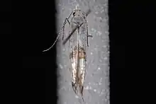 The wingspan is 10โ13 mm. The forewings are silvery white, with a pale golden brown streak at the base of the costa. The hindwings are dark gray.[2] Adults are on wing from the end of June to mid August.