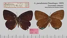 A. pseudomuta is much larger than elopura, the male violettish-blue, almost-lilac, the under surface regularly marked, as is to be seen from the figure; Malacca, Borneo. A. rafflesii Nic. [synonym] above dark blue instead of violet, with a slight difference of the postmedian band on the hindwing beneath, where the 4th spot is slightly removed towards the margin.[4]