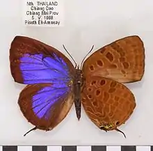This article incorporates text from this source, which is in the public domain. - ↑ D'Abrera, B. 1986. Butterflies of the Oriental Region, Part III Lycaenidae & Riodinidae: pp. 536–672. Hill House, Melbourne.