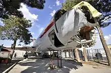 The aircraft was reported to have skidded off the runway. The cockpit area of the aircraft was destroyed by the impact with the airport perimeter wall. Nineteen people were reported to have been injured in the accident.[5] The weather was good at the time of the accident, with the METAR in force at the time reading "METAR OIMM 241300Z 08014KT CAVOK 34/M03 Q1012 A2989".[6] This translates as, METAR for Mashhad International Airport, issued on the 24th of the month at 13:00 UTC, wind at 14 knots (26 km/h), wind direction 080°; ceiling and visibility OK; temperature 34 °C; dew point −3 °C; altimeter 1012 millibars or 29.89 inches of mercury.[7] The aircraft landed with a crosswind.[2] It landed "long" and overran the end of the runway, hitting a wall located more than 1,100 metres (1,200 yd) further on, which demolished the forward section of the aircraft.[2][8][9]