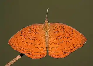 Male: Upperside brownish ochraceous. Forewings and hindwings crossed by slender, somewhat obscure, very sinuous or zigzag dark basal, two subbasal and two discal lines disposed in pairs, followed by a single, sometimes double, postdiscal and a single subterminal slender line. All these lines more or less interrupted anteriorly on the hindwing, which has a smooth unmarked uniform appearance from costa to subcostal vein and vein 5. On the forewing there is in addition a series of obscure spots between the postdiscal and subterminal markings, arid a small white subcostal spot before the apex. Underside much as in Ariadne ariadne, but the transverse chestnut bands broader, more diffuse. Antennae, head, thorax and abdomen brownish ochraceous. Sex-mark on the underside of the forewing as in A. ariadne no sex-mark on upperside of hindwing.[3][4]
