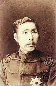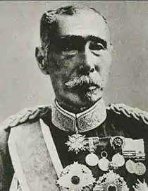 Gensui Prince Yamagata Aritomo (山縣 有朋, 14 June 1838 – 1 February 1922) also known as Prince Yamagata Kyōsuke,[1] was a Japanese statesman and military commander who was twice-elected Prime Minister of Japan, and a leading member of the genrō, an élite group of senior statesmen who dominated Japanese politics after the Meiji Restoration. As the Imperial Japanese Army's inaugural Chief of Staff, he was the chief architect of the Empire of Japan's military and its reactionary ideology.[2] For this reason, some historians consider Yamagata to be the “father” of Japanese militarism.[3]
