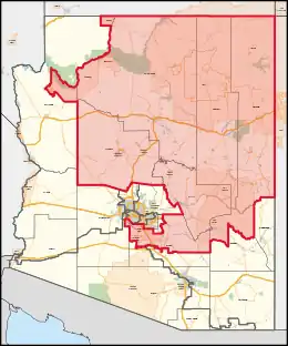 Arizona's 2nd congressional district is a congressional district located in the U.S. state of Arizona. The district is in the north eastern part of the state and includes Apache, Coconino, Gila, Navajo, and Yavapai counties in their entirety and portions of Graham, Maricopa, Mohave, and Pinal counties. The largest city in the district is Flagstaff.