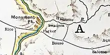 - 11.0 Midway, a watering stop marking the midpoint of the route, located at 34°04′14″N 113°53′12″W / 34.07056°N 113.88667°W. Today, a Bureau of Land Management plaque marks the site.[1][2]