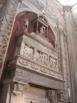 Another order from the Council dates to 1506, ordering the College of Notaries to fulfil the work.[5] Finally, in 1508, three people were appointed by the council to preside over the expansion of the chapel of Sant'Apollonio so that it could encompass the marble reliquary ark (archa marmorea et miro artificio fabricata de pecuniis collegii notariorum Brixie).[6][7] The works are thereby documented from December 1509 through November 1510, with fees for interventions such as the lowering of the floor and the remaking of the walls and the arch, the last by a master Benedictus lapicida.[8] The expenses were considerable, nearly 300 lire planette (the Brescian currency of the time).[9]