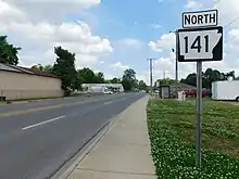 The Highway 141 designation begins in Jonesboro as Main Street at a bridge over a rail yard where a One-way pair of roads (Main Street and Union Street) combine north of downtown Jonesboro. At the north end of the bridge, Highway 141 intersects Highway 91 (Johnson Avenue) then continues north through a residential area of the city. Highway 91 crosses Lost Creek Ditch before curving one block and becoming Church Street. The road continues north, passing the Jonesboro Math and Science Magnet School, crossing Culberhouse Lateral, and running through a neighborhood known as Philadelphia before leaving the city limits of Jonesboro and entering a rural part of Craighead County.[5] At an intersection with Craighead County Road 766 (New Haven Church Road), Highway 141 meets the Crowley's Ridge Parkway, a National Scenic Byway designation that follows the Crowley's Ridge landform, with the Parkway designation following Highway 141 northbound through the unincorporated communities of Sterling Spring and Herndon before entering Greene County.[6]