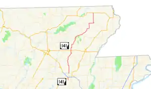 Highway 141 winds north through the unincorporated community of Knob, where it passes a historic schoolhouse listed on the National Register of Historic Places,[8] before forming a concurrency with Highway 90 toward Boydsville. In Boydsville, Highway 141 and Crowley's Ridge Parkway turn north from Highway 90 and begin running as a section line road to the small town of McDougal 4.5 miles (7.2 km) south of the Missouri state line. In McDougal, Highway 141 terminates at an intersection with US 62 (Dale Street), with the Parkway designation following US 62 eastbound.[9]