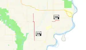 Highway 318 begins at Highway 1 southwest of Marvell in the Arkansas Delta. The highway runs due south as a section line road to Cypert, where it passes through the Turner Historic District, listed on the National Register of Historic Places.[4] The route continues south to Watkins Corner, where it intersects Highway 318Y, a short connection providing access to Highway 316 for westbound traffic. Highway 318 intersects Highway 316 and the Great River Road, including a brief officially designated exception.[a 1] After this short eastbound concurrency, Highway 318 continues due south again, now concurrent with the Great River Road, as a section line road, bridging Big Creek and crossing two levees before a junction with Highway 20 near Lambrook, where the route terminates.[3] The Great River Road continues west along Highway 20 to Elaine.