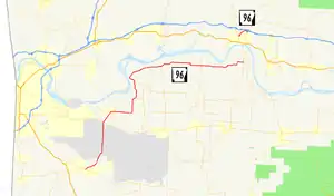 AR 96 begins at AR 10 in Greenwood.[3] The route runs north through Fort Chaffee and crosses AR 22 and AR 255. It continues north then east to cross AR 41 and eventually terminate at AR 23 in Franklin County.[4]