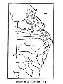 On December 31, 1813, the Missouri Territorial legislature created new counties and at the same time divided the former District New Madrid into the counties of New Madrid and Arkansas.[1][41] At the same time the militia of Arkansas County was designated as the 7th Regiment, Missouri Territorial Militia.[42] The following regimental officers were appointed:[43]