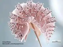 Armadillidae is a family of woodlice (Oniscidea; terrestrial crustaceans), comprising around 80 genera and 700 species. It is the largest family of Oniscidea, and one of the most species-rich families of the entire Isopoda.[1][2] Armadillids generally have a strongly convex body shape, with some rather shallowly convex.[3] Like members of the woodlice family Armadillidiidae, armadillids are capable of enrolling into a sphere (conglobation), and are commonly known as pill bugs.[4][5] Armadillids differ from the Armadillidiidae in that the antennae are fully enclosed within the sphere.[6]