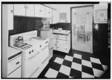 Armco-Ferro House is based on a traditional four-square. There are four rooms on the first floor and four rooms on the second. The four-square allows for cross ventilation in all weather and all seasons. The original garage was open for the 1933 fair season and enclosed for the 1934 fair season, becoming a study. A porch was added the second year [5] The living room of the Armco-Ferro House as it was decorated for the 1934 fair season. The furnishings for this season were very traditional – the spaces were not cluttered with too many pieces as in 1933.[4][6] The dining room of the Armco-Ferro House as it was decorated for the 1934 fair season. The furnishings were very traditional, as was the use of a wood wainscot detail. Note however that the lighting did not change from that used in 1933.[6] The kitchen of the Armco-Ferro House as it was decorated for the 1934 fair season; looking toward the laundry room. The only changes that can be discerned from the 1933 season are the use of a Masonite "tile" wainscot, the "picture frame" pattern in the linoleum, and the cabinet/appliance layout. .[4][6] The dining room of the Armco-Ferro House as it was originally decorated for the 1933 fair season. The decorators thought "outside the box" when designing this room. Rather than using it solely as the dining space they created two use areas. The dining table was set on an outside wall under a window, and in the opposite corner they placed a card table for recreational purposes.[4][7] The boy's room of the Armco-Ferro House as it was originally decorated for the 1933 fair season. The furnishings for this season were very modern with rectilinear lines and details. Two unusual pieces of furniture for the time period included the hanging bunk bed, and the bookcase, which doubled as the stair for the bed.[4][7]