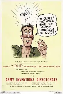 - ↑ Poster: By cripes! That would save the army hundreds of quids!, Unit:Army Inventions Directorate, 1943, The Australian War Memorial