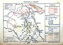 The battle of Beaumont had for consequence the renunciation of Marshal Mac Mahon to come and rescue Bazaine at Metz. Contrary, he unfolded since August 30 the different corps on the cities of Bazeilles and Sedan.[8]