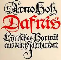 In 1903, he wrote Songs on an old Lute inspired by the poetry of the Baroque era. This volume was later expanded as Dafnis and published by Reinhard Piper, and one of Holz's few financial successes. The poems incorporated in the volume's, design, subject, and layout celebrations of Baroque eating and erotic events. Holz also received recognition for his tragicomedy Traumulus (1904), the first of five he created with his friend Oskar Jerschke. The work was produced on many stages upon its publication and in 1935 it became the basis of a film produced by Carl Froelich starring Emil Jannings in the title role.