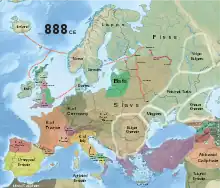- ↑ East Francia had been split from the rest of Frankish Realm by the Treaty of Verdun in 843. It evolved into Holy Roman Empire after end of Carolingian rule.