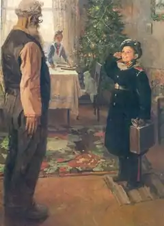 The painting itself depicts a joyful event. A family greets a young boy, a returning Suvorov military cadet, who has come home for the New Year celebration and long holidays. The grandson, in military uniform, is happy – with a glowing face and a wide smile, he greets his grandfather with a mock military salute. His grandfather stands at attention, accepting the salute. The characters in the painting are the Suvorov military cadet, his grandfather, and a girl wearing a Pioneer tie, depicted with love and humor.[3] The festive atmosphere in the house and the characters' charm highlight the painting's optimism, showing that the long war is over and a bright and happy future is ahead. On the other hand, the piece also has a sense of drama as the boy's parents are not depicted. The fact that after the war, children who had lost their relatives often enrolled in the Suvorov Military School, hints that they may not have survived.[4][5]