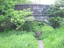 Although not part of the Otley and Ilkley Joint line the branch to Yeadon arose from approaches made to the NER in 1881 to construct a line from Guiseley to Headingley via Yeadon. This would have shortened the journey between Ilkley and Leeds by three miles compared to the route via Otley. The NER did not wish to participate and instead the new Guiseley, Yeadon and Rawdon railway turned to the Midland Railway. Finding some favour[23] the company obtained parliamentary approval for a 1 mile (1.6 km) line from the Midland line south of Guiseley to Yeadon.[24] Despite plans and parliamentary approval to extend the line to Headingley, the company could not raise the necessary capital and the Guiseley—Yeadon section was sold to the Midland who opened the line to freight traffic only in 1894.[25] Despite a station being built at Yeadon there was never a regular passenger service, only occasional excursions, and the line continued as a freight only line until it closed in 1964.[25] The section of disused trackbed now forms part of the Aireborough Greenway.[26]